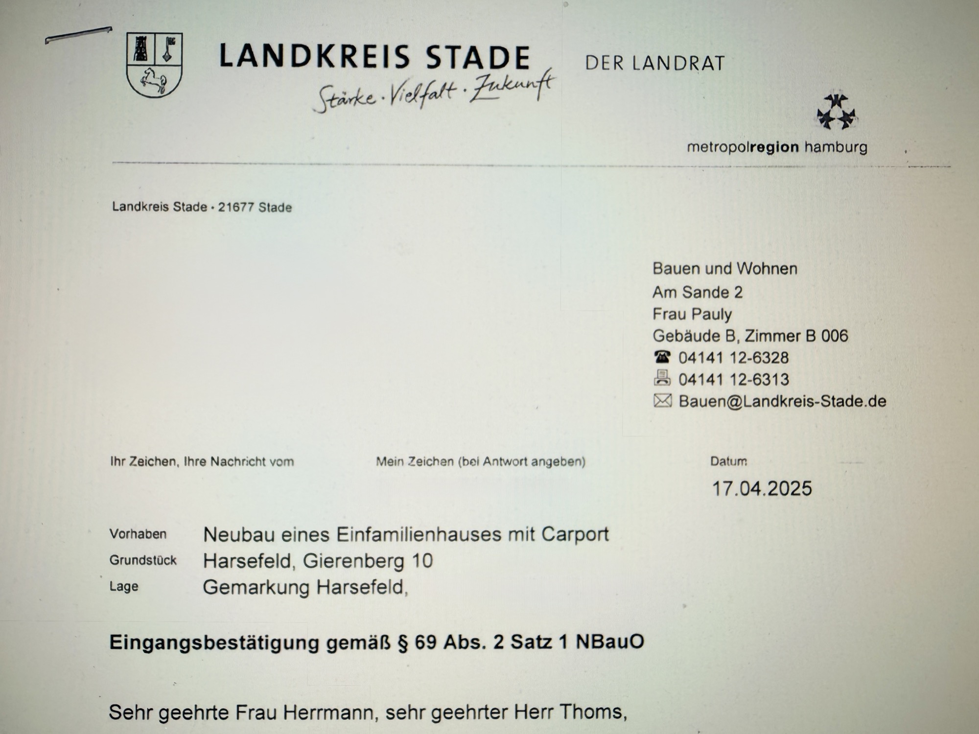 Viebrock hat unseren Bauantrag beim Landkreis Stade eingereicht.